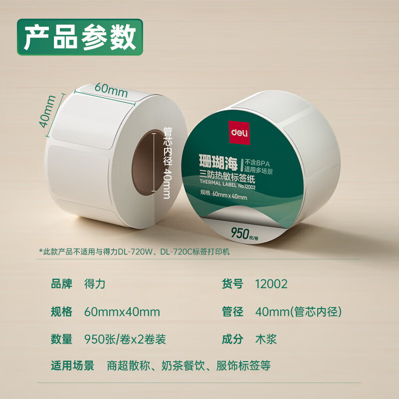 得力(deli) 标签纸60*40mm 950枚(白)(2卷/筒) NO.12002