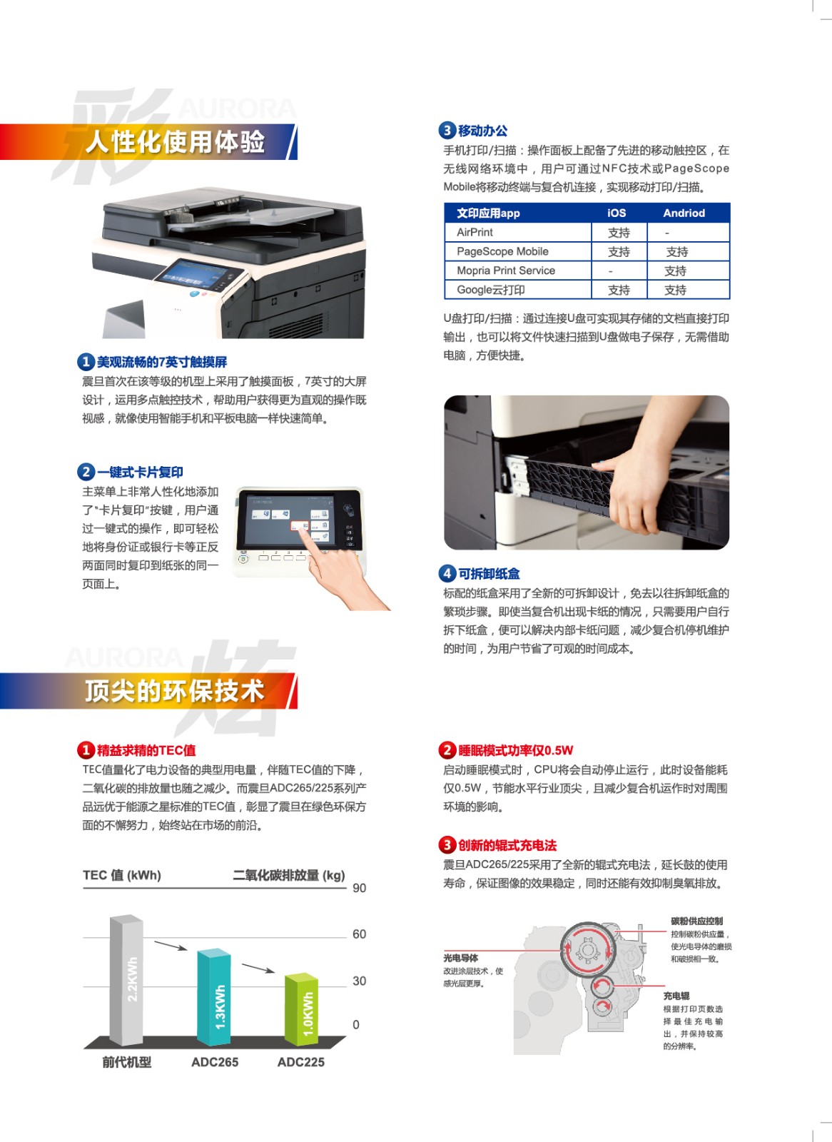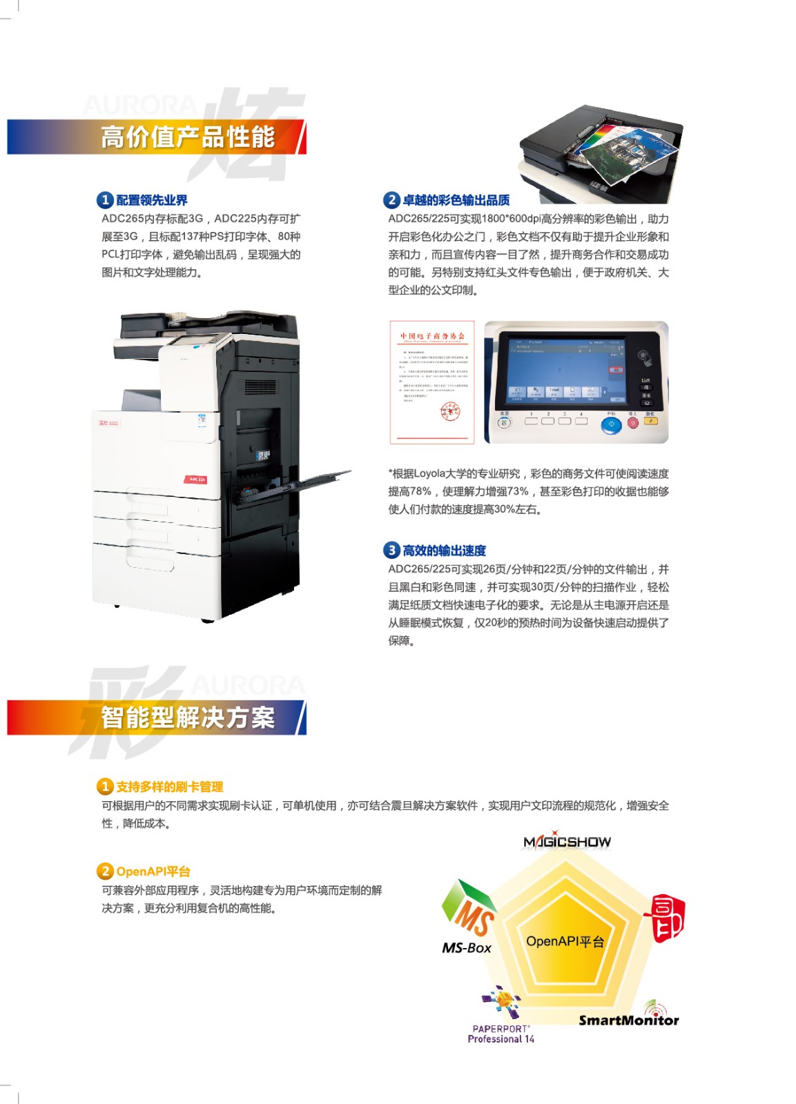 复印功能:黑彩同速:22张/分钟,首张出纸速度为8.1秒,预热时间低于44秒 连续复印:1-999份,分辨率:600*600dpi,缩放:25%-400%(0.1%可调),一键式身份证功能,多合一复印