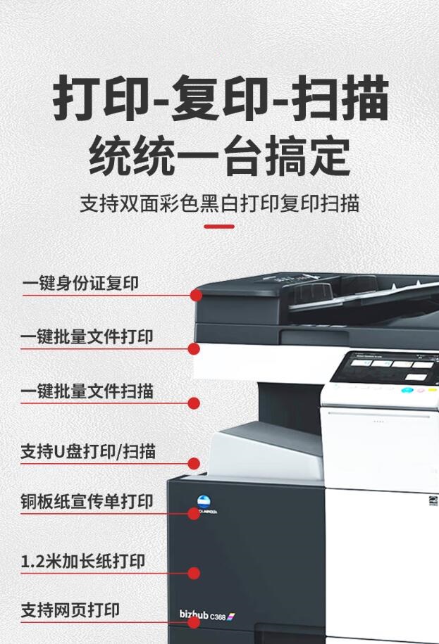 复印功能:黑彩同速:45张/分钟,首张出纸速度为8.1秒,预热时间低于44秒 连续复印:1-999份,分辨率:600*600dpi,缩放:25%-400%(0.1%可调),一键式身份证功能,多合一复印