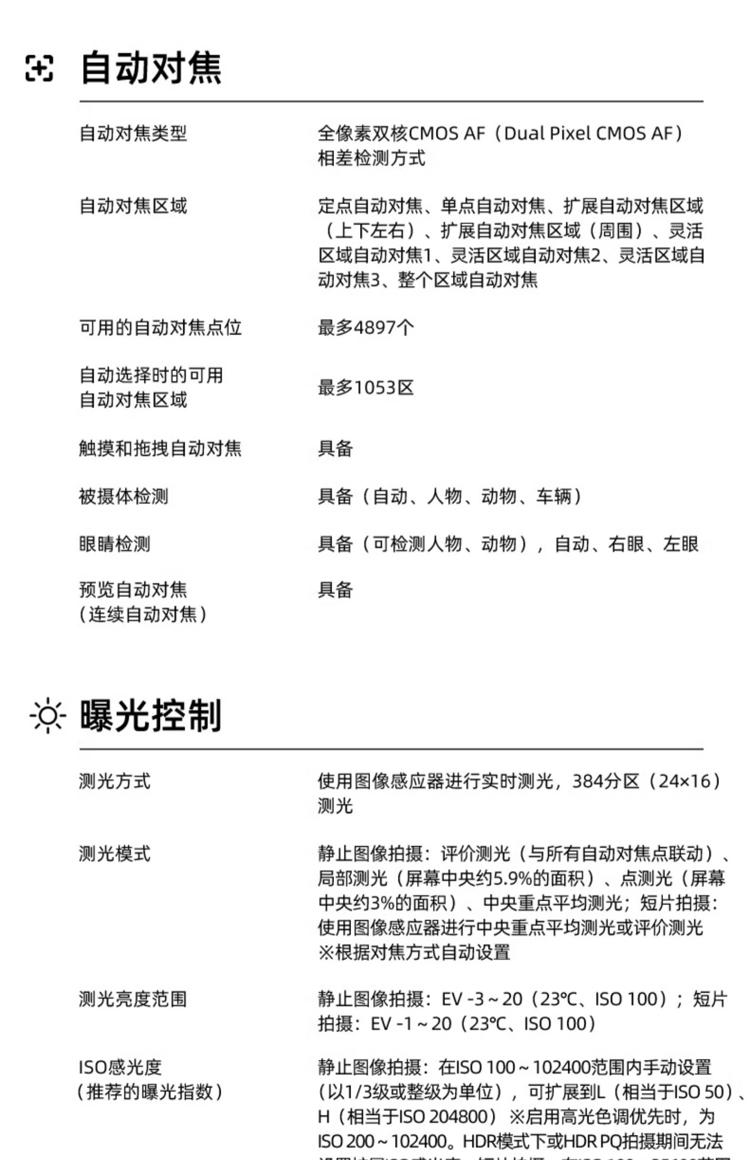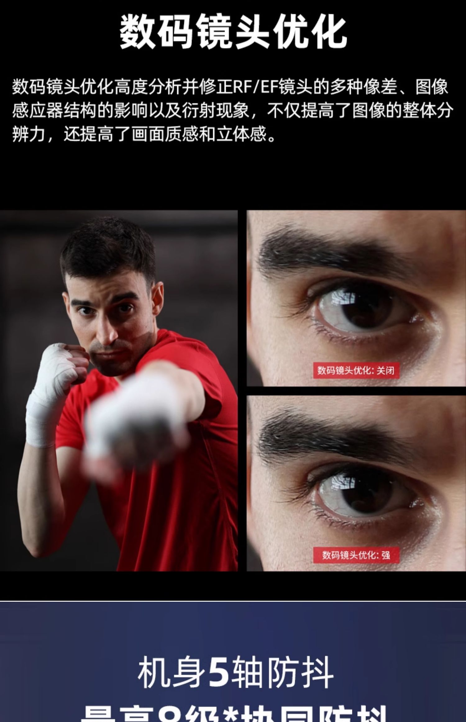 视频创作:支持6K RAW外部记录、6K超采样全画幅无裁切4K 59.94p短片等,还具备Canon Log 3、HDR PQ等功能,能满足专业视频制作需求,适合拍摄广告、纪录片等。同时,机身防抖与数码防抖可协同工作,手持拍摄视频也能保持稳定,适合Vlog拍摄。