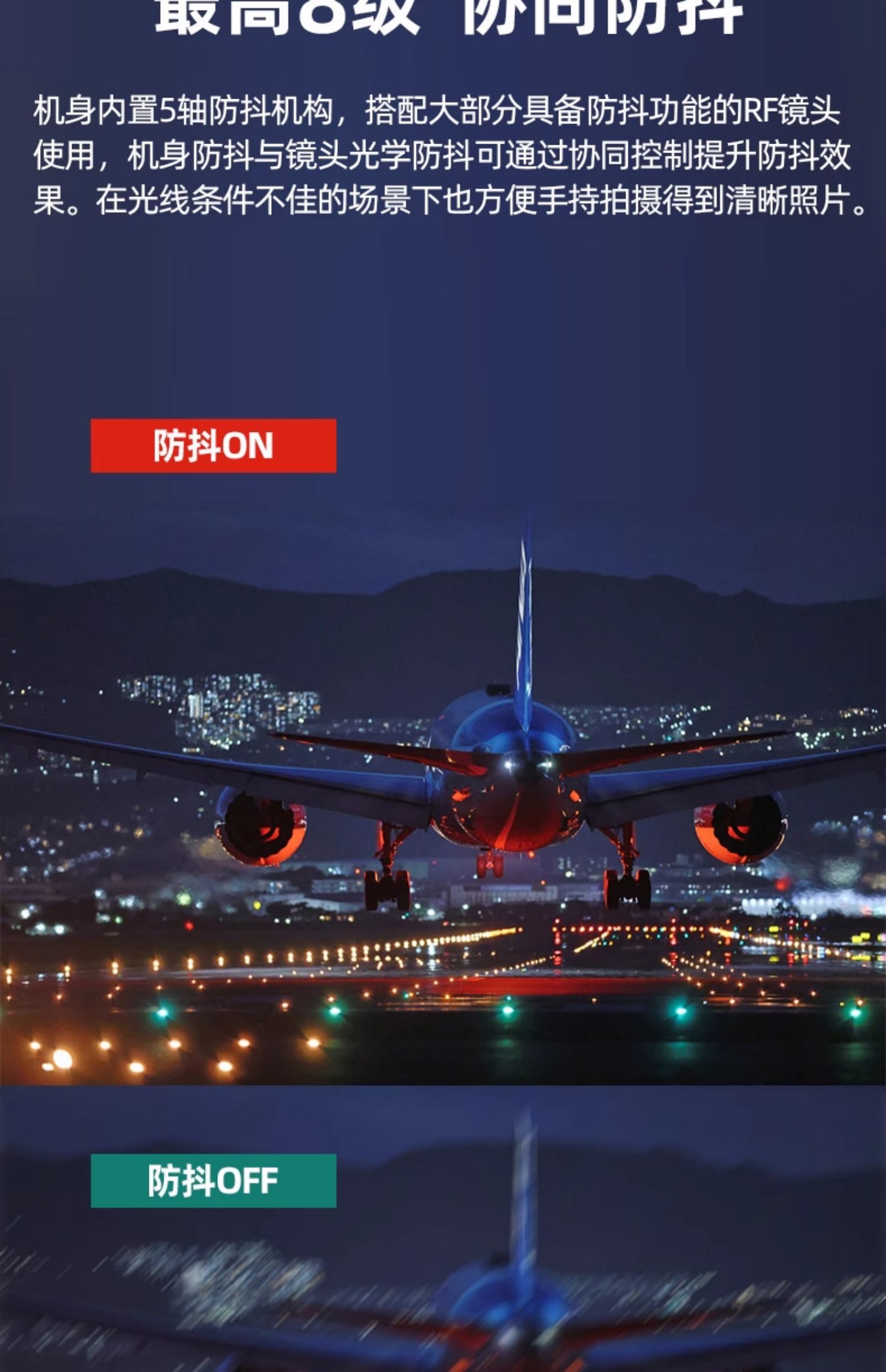 风光摄影:机身内置5轴防抖机构,与防抖镜头搭配最高可获得 8 级抖动补偿,方便在光线不佳时手持拍摄。高感光度可扩展至ISO 204800,拍摄夜景等题材时,可通过提高感光度获得清晰画面。