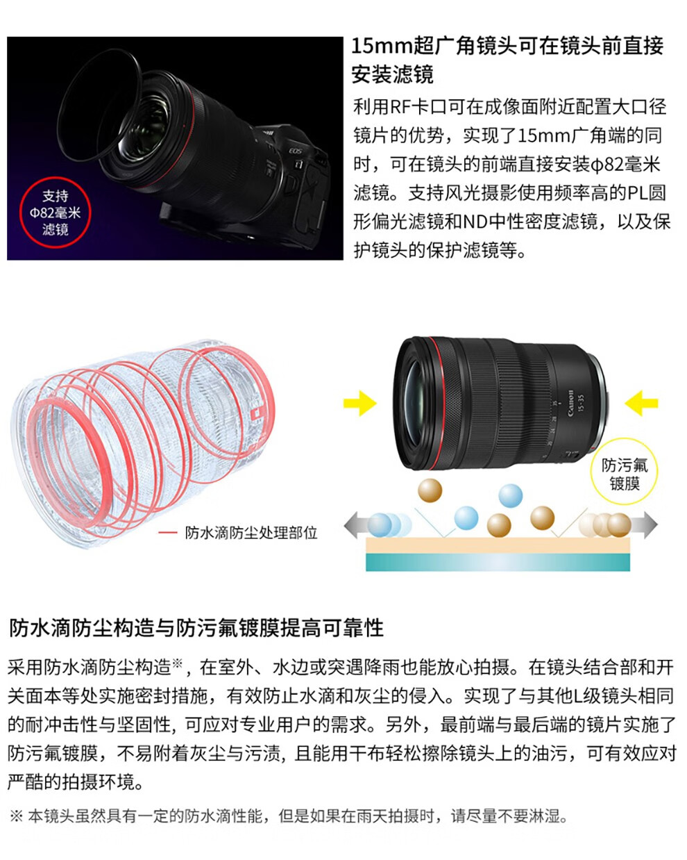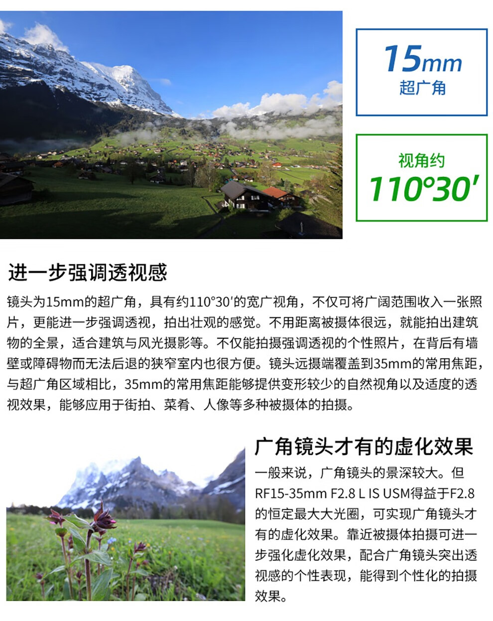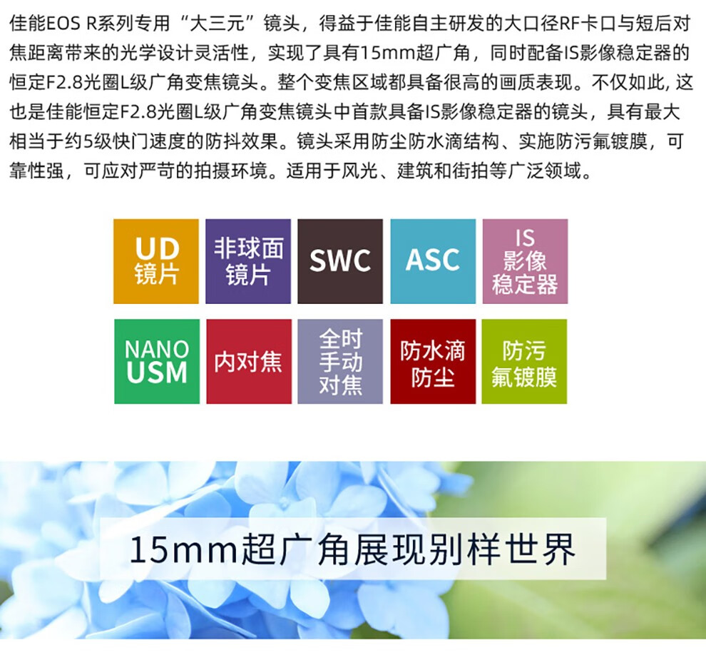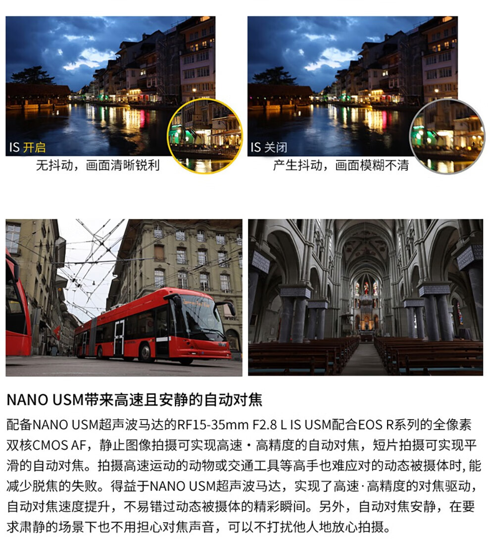 风光摄影:拥有15mm超广角,视角达约 110°30′,可将广阔风景尽收画面,强调透视效果,拍出壮观之感,适合拍摄山脉、大海、草原等大场景。搭配 5 级防抖效果的 IS 影像稳定器,手持拍摄也能保证清晰,在野外不便使用脚架时优势明显。